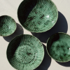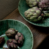 De schaal is vervaardigd uit aardewerk en onderscheidt zich door de unieke, zonverweerde groene glazuurlaag. De textuur is ambachtelijk met de hand aangebracht in de vorm van een schelpachtige structuur, waardoor elk exemplaar een uniek, handgemaakt gevoel heeft. Met een diameter van 22 cm en een diepte van ongeveer 5,5 cm is de schaal perfect voor het presenteren van bijgerechten, eenpersoons salades, kleine pastaporties of een elegante portie fruit. De schaal is niet alleen mooi, maar ook uiterst praktisch: hij is vaatwasserbestendig en kan veilig gebruikt worden in zowel de magnetron als de oven (tot 200°C).